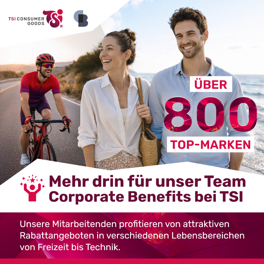 Deshalb haben wir Corporate Benefits als festen Vorteil bei TSI eingeführt. Warum? Weil Wertschätzung für uns nicht bei Worten endet, sondern im Alltag spürbar sein soll.