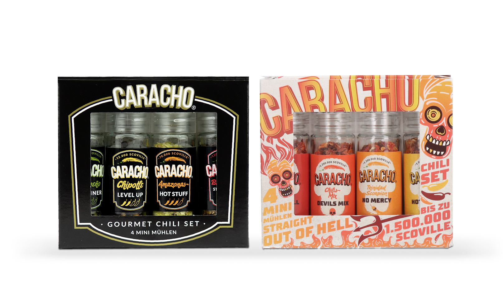 Das Caracho Chili-Mühlen Set 2 beinhaltet die Sorten Bhuz Jolokia, Trinidad Scorpion, Chili Mix und die Carolina Reaper Chiliflocken. Die Scoville Skala reicht von 1.000.000 bis zu 1.500.000 Scoville.