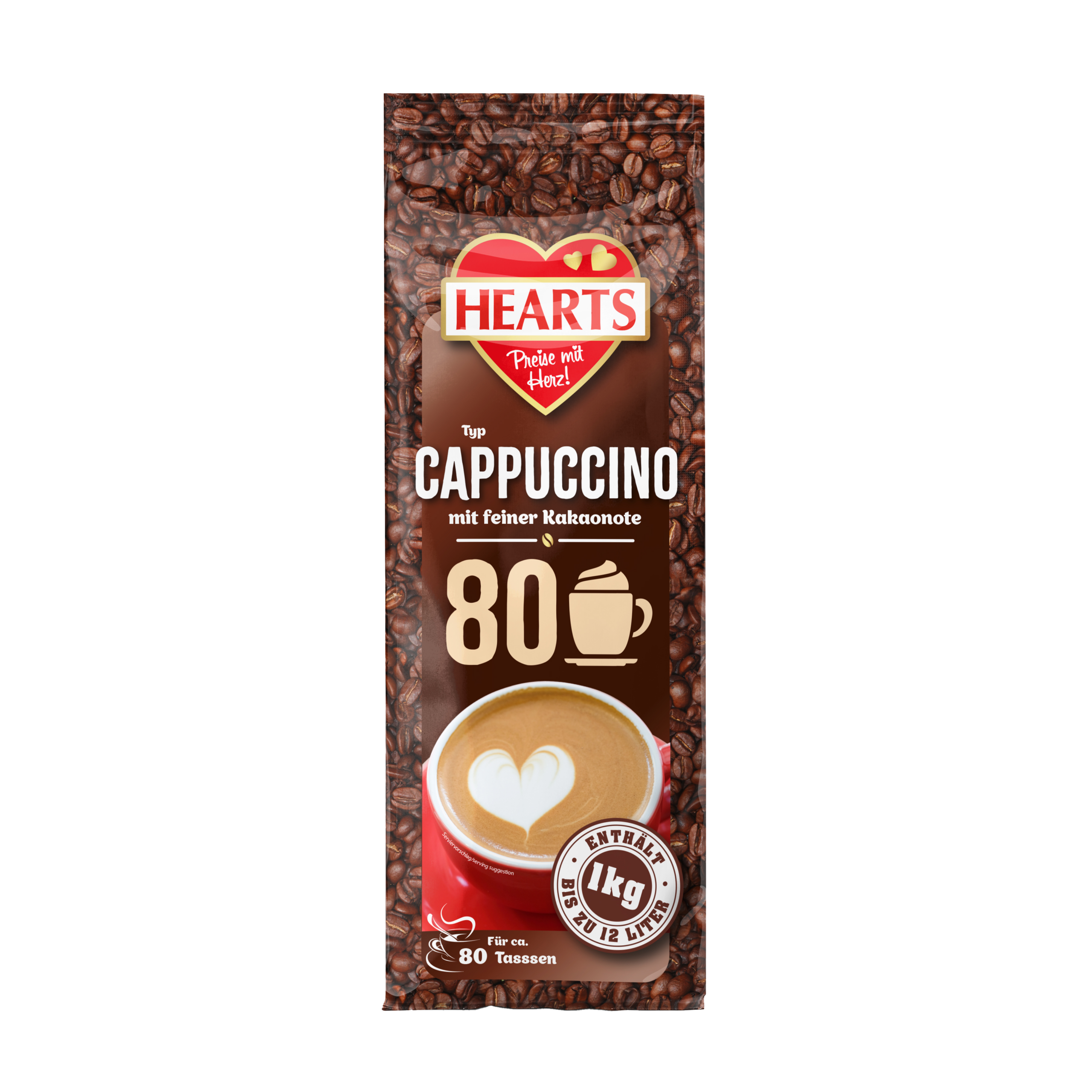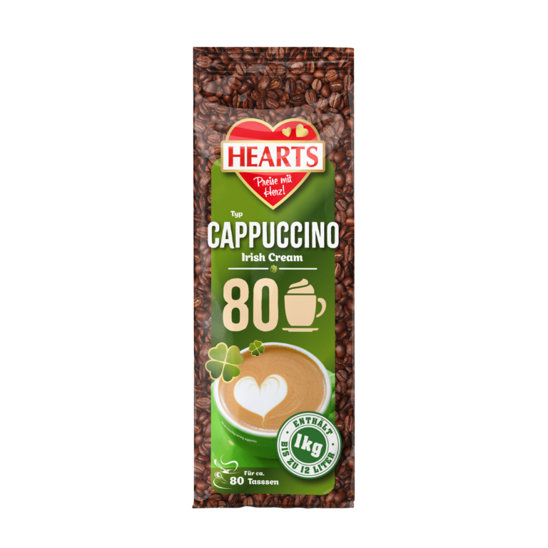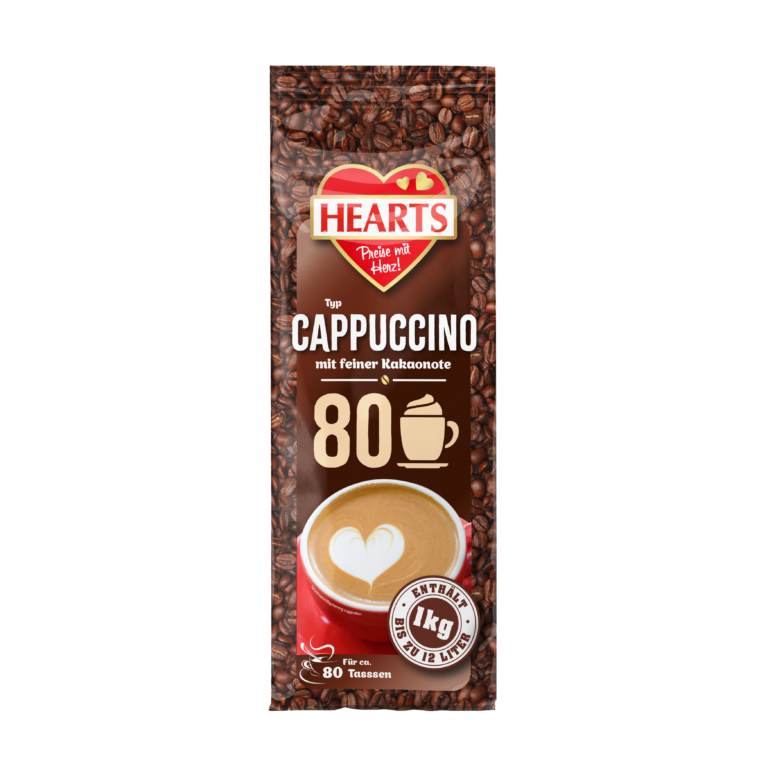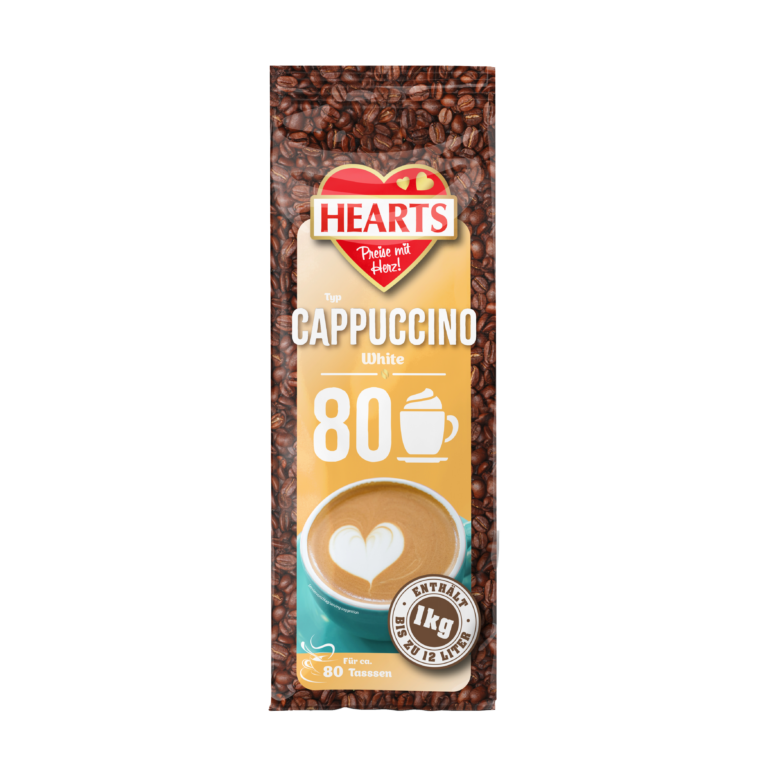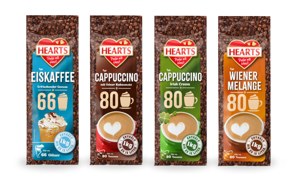 HEARTS bietet heißen und kalten Trinkgenuss im ergiebigen 1 kg Beutel. Egal, ob klassische Cappuccinos, besondere Cappuccino Varianten, cremige Trinkschokolade, erfrischende Eiskaffees oder würzige Chai Latte. Das HEARTS Feeling verzaubert!